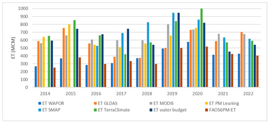 Figure 8 compares the annual ETa volume derived from six remote sensing datasets over the AZB, alongside FAO56 PM and the national water budget. The results from the six remote sensing datasets, when compared to WaPOR data, indicated that the average annual WaPOR AETI was approximately 528 MCM, which is lower than the average of the other datasets (572–692 MCM). This suggests that WaPOR may underestimate ET, with the highest correlation for the WaPOR dataset found with ET MODIS 500m. Conversely, WaPOR AETI was compared with evaporation estimates reported in the national water budgets from 2014 to 2022. In these budgets, the reported evaporation exceeded WaPOR’s data for all years, except in 2021, when reported evaporation fell short of WaPOR’s data by −38 MCM.