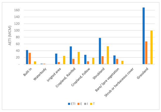 WaPOR-AETI and its components for the different land and water use categories in the AZB during 2022.