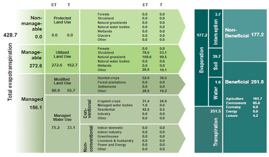The WA+ framework was developed to use open-access remote sensing-based data for WA at the basin level [17]. The framework combines remote sensing-based data with other available global data and ground measurements to produce standardized WA+ sheets supported by graphs, maps, and tables. The framework of WA+ uses sheets that integrate remote sensing data and simulate water balance, comprehensively assessing water availability and consumption. The most important sheets of WA+ are the resource base and the ET sheets, which can be utilized for the remaining sheets of agricultural services, utilized flow, surface water, and GW. For this study, the resource base sheet was used to provide a comprehensive overview of a basin’s annual water budget and to analyze inflows and outflows. Inflows included precipitation, surface, and groundwater inflows. Outflows included surface and groundwater outflows and actual ET. The second sheet in the WA+ framework was the ET sheet, which was used to estimate water outflows in the form of ET across the various water use categories derived from the LC map. The water use within WA+ included four different water management classes for ET and T [13,17,25], providing an overview landscape of water consumption. Within this sheet, ET components include interception, evaporation, and transpiration. The values of ET and T were evaluated for the non-manageable, manageable, and managed types of water and land use (WALU). This was carried out to calculate the percentage of each component of ET according to WALU, which would allow the identification of the portions of beneficial and non-beneficially used water. This information would not be found in the traditional water budget. Furthermore, the outputs derived from both sheets were utilized to compute the quantitative performance indicators (PIs) related to water availability and utilization at the basin level (Table 3).