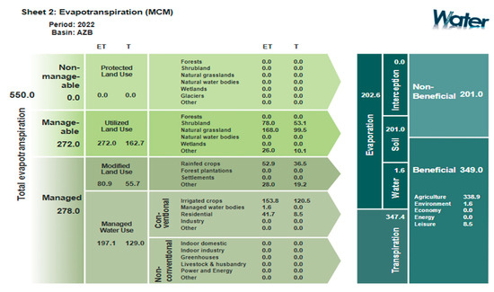 The ET sheet shows that the most beneficial use of water in the AZB is related to agriculture, followed by environmental use. The shares of manageable and managed water consumption to the total water consumption ranged from 156 to 362 MCM and from 101 to 215 MCM, respectively. Manageable land use classes have consumed more water than managed land use classes in the basin; there were no non-manageable shares in the basin. Following the correction, the ET sheet was updated (Figure 13) to account for the increased ET in irrigated areas. As a result, the water consumption attributed to the managed land use class increased by a factor of 1.8 relative to the manageable land use class. Additionally, the beneficial fraction improved, rising from 59% to 63%, reflecting a higher proportion of water use contributing to productive outcomes.