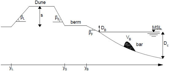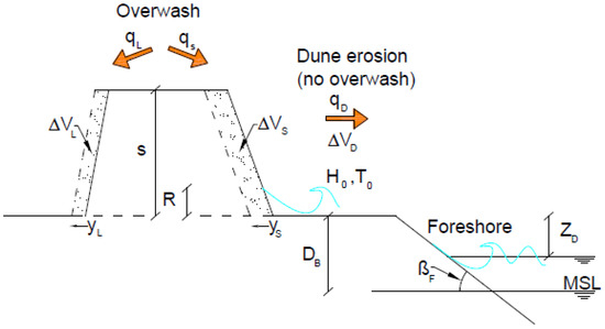 To illustrate the evolution of the profile, a storm impact is considered as an example. If the waves, along with the water level, generate sufficient runup (R), meaning that the wave runup exceeds the base level of the dune, the dune will lose volume (∆VD) and supply sand to the beach berm (Equation (1)). As a consequence of this erosion, the dune’s base shifts inland, and YS decreases, assuming a constant dune slope.