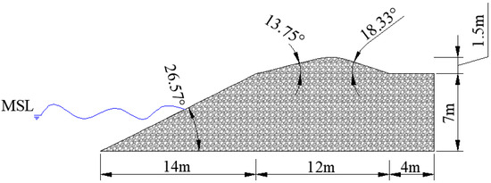 Several preliminary tests were carried out with the objective of defining a profile vulnerable to wave attack but without overtopping, so that different reinforcement measures for the profile and their respective performance could later be evaluated. By varying the geometric parameters of the profile and the wave climate, some preliminary conclusions were drawn. In this regard, the profile represented in Figure 6 was considered for the reference scenario with the following values (prototype): 4 m (YL) for the location of the dune toe on the landward side, dune height of 1.5 m, and the position of the dune toe on the seaward side at 16 m (Ys). This position coincides with the berm crest (YB), meaning that the reference profile does not include a berm.