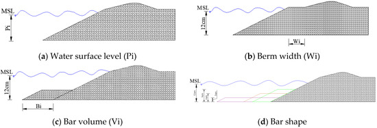 The beach profile in the physical model was designed to simulate sediment redistribution under wave forcing, with a double-slope configuration and without an initial bar. As highlighted in [9], simplified representations in flume tests are necessary to control variables and ensure repeatability. Therefore, the reference scenario profile assumes a zero volume for the bar. Subsequently, scenarios considering the presence of an initial bar volume are presented. It should be noted that the CS-Model does not simulate the geometry of the bar nor specify its exact position, considering only an available volume of sediments for bar–berm exchanges.