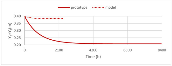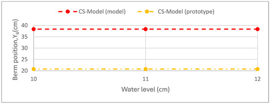 Figure 9 shows the time evolution of the berm position, allowing for a comparison between the numerical simulation results. It can be seen that the time evolution of the berm position in the CS-Model is independent of the tested scenario. At the model scale, there is a nonlinear reduction from 40 cm to 38.35 cm, while at the prototype scale, there is also a nonlinear decrease of the berm position, from 40 cm to 20.75 cm.