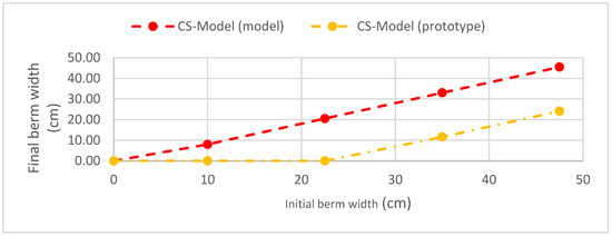 For the study of berm width, four scenarios (C3 to C6) were defined with initial berm widths of 10 cm, 22.5 cm, 35 cm, and 47.5 cm. The results from the numerical modeling are shown in Figure 10, which presents the final berm width as a function of the initial berm width. The CS-Model simulation at the model scale for scenarios C0 and C3 to C6 resulted in final berm width values ranging from 0 cm to 45.50 cm. In contrast, the CS-Model at the prototype scale yielded values between 0 cm and 24.13 cm.