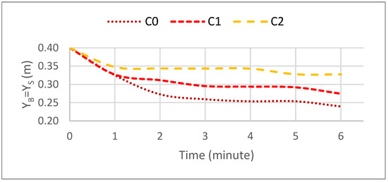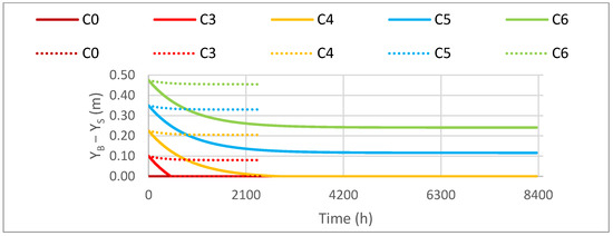 Figure 11 shows the time evolution of the berm width for each scenario (C0 and C3 to C6), based on the calculations performed by the numerical model. In the CS-Model, a nonlinear decrease in berm width over time is observed, tending to converge toward equilibrium. At the model scale, berm width decreased from 10 cm to 8 cm, from 22.50 cm to 20.50 cm, from 35 cm to 33 cm, and from 47.50 cm to 45.55 cm for scenarios C3 to C6, respectively. At the prototype scale, the berm width also decreased from 10 cm to 0 cm, from 22.50 cm to 0 cm, from 35 cm to 11.63 cm, and from 47.50 cm to 24.13 cm, according to scenarios C3 to C6, respectively. Therefore, the variations at the prototype scale are more significant. The results from the CS-Model at the model scale show similar differences from the beginning to the end of the simulation across all scenarios, with the berm width becoming null in scenarios C3 and C4.