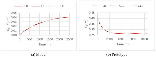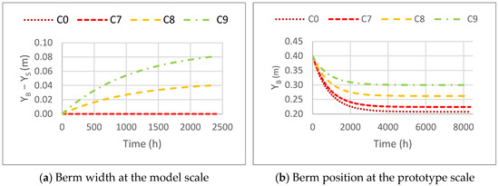 Figure 14a presents the time evolution of the berm width, representing the result of the CS-Model at the model scale for the three scenarios (C8, C10, and C11), while Figure 14b presents the time evolution of the berm in the CS-Model at the prototype scale, with the berm position varying from 40 cm to 26.18 cm.
