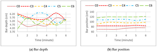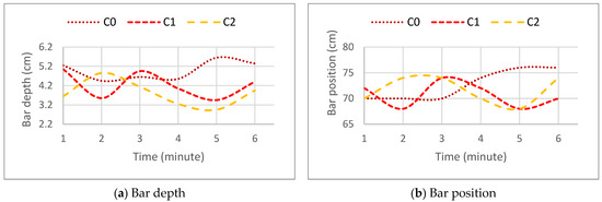 Figure 16 shows the variation over time in the depth and position of the bar crest in scenarios C0 to C2. The bar crest was identified as the inflection point of the bar shape, characterized by the change in the slope of the upper face of the submerged profile.