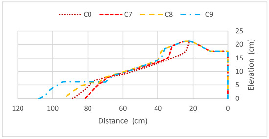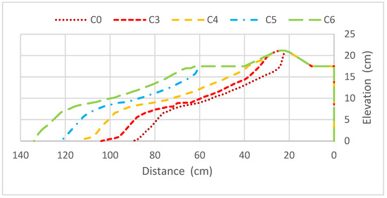For the study of berm width, four scenarios (C3 to C6) were defined with the following berm widths: 10 cm; 22.5 cm; 35 cm; and 47.5 cm. Figure 19 represents the morphology of each laboratory test at the end of six minutes, thus allowing the observation of the effect of increasing berm width. It should be noted that the greater the initial berm width, the smaller the retreat of the dune toe position at the end of the test, and consequently, the smaller the erosion caused to the dune.