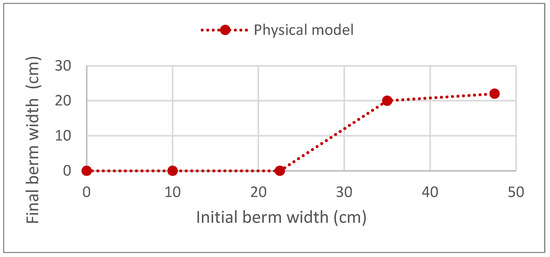 The results of the physical model are shown in Figure 21, where the final berm width is presented as a function of the initial berm width. The physical model shows final berm widths ranging from 0 cm to 22 cm.