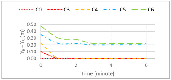 Figure 20 shows the variation over time in bar depth and position for scenarios C0 and C3 to C6. In Figure 20a, it is observed that the bar crest depth is independent of the amount of material used, displaying an oscillatory behavior over time, which tends to converge to the same value of 5.35 cm at the end of the test. In Figure 20b, it is observed that the bar position is directly proportional to the berm width, with larger berm widths corresponding to a further offshore bar crest position.