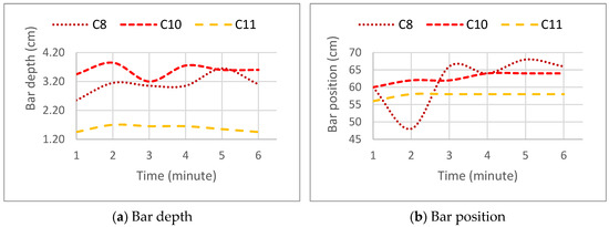 Variation in bar depth and position over time, for scenarios C8, C10, and C11.