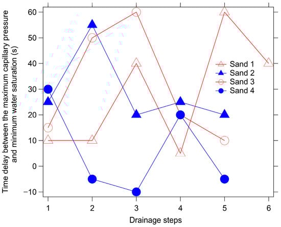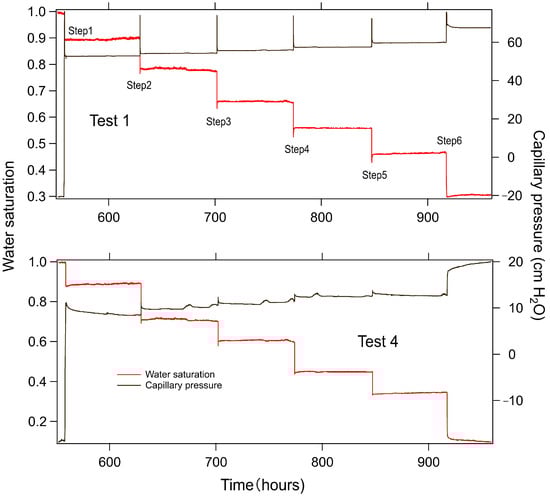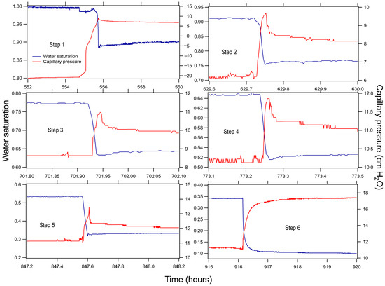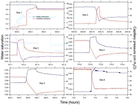 3.1. Temporal Evolution of Hydraulic Saturation and Capillary Pressure
