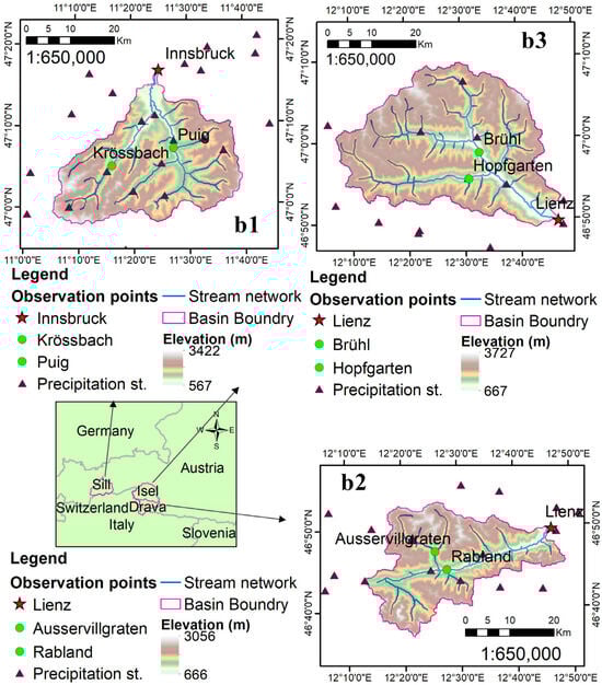 Pilot areas b1 Sill, b2 Drava and b3 Isel with stream network and locations of meteorological and hydrological stations.