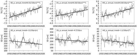 Annual means, 11-year moving averages and linear trends of the observed climate indices (TG, SD) at stations Sonnblick (SO), Zugspitze (ZU) and Hohenpeissenberg (HO), and runoff index (Q) at stations Innsbruck (INN), Rabland (RAB) and Lienz (LIE) in period 1951–2018. Notation of trend significance: *** for p < 0.001, ** for p < 0.01, * for p < 0.05, + for p < 0.1.
