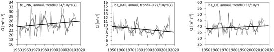 The 1951–2018 long-term trends for the annual Q show alternating variations between the catchments. In catchment b2 Drava, there is a weak negative trend in annual Q, with a clear break around the 1980s (RAPS plots in Figure 3), while in catchments b1 Sill and b3 Isel, there is a weak positive trend without an obvious break. However, after 1981, the annual Q shows a positive trend across the pilot area. After examining the variations and perturbations in the climate and runoff indices in the period 1951–2018, the period after 1991, in which there were no obvious breaks in the TG, P, SD and Q trends, was selected for the evaluation of the GPPs.