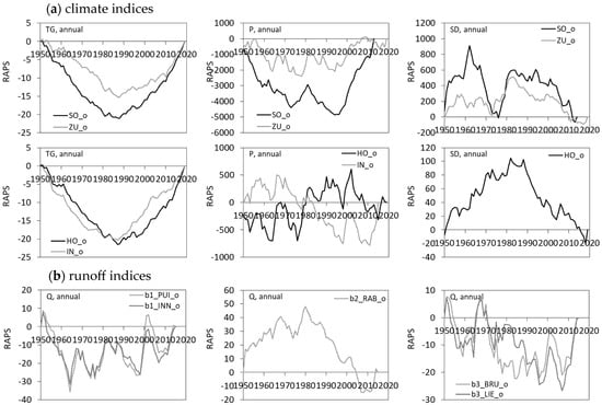 The following metrics were used to evaluate long-term variations in climate (TG, P, SD) and runoff (Q) indices: (i) 11-year moving averages, (ii) the slope of linear regression (LinT), and (iii) the trend significance using the non-parametric Mann–Kendall test [112,113]. The breakpoint in the trend was identified using the (iv) Rescaled Adjustment Partial Sums (RAPS) method, as the visualization approach can compensate for small systematic fluctuations in the record [114].