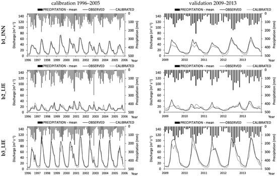 The model skill for the calibration and validation periods (Table 9) shows good performance for catchments b1 and b3 (NSE = 0.90 and 0.93 for the calibration period, NSE = 0.84 and 0.89 for the validation at the outlets). The simulated hydrographs (Figure 4) show that the observed runoff regime for catchments b1 and b3 is well reproduced during both the calibration and validation periods. The model has slightly lower performance in the upstream river sections. The model has worse performance in catchment b2 (NSE = 0.67 for the calibration period and 0.50 for the validation at the outlet). The observed hydrograph in catchment b2 does not show snowmelt-induced high spring discharges as in the other two catchments (Figure 4). One of the probable reasons for the worst performance in catchment b2 is the fact that the Drava River originates from a spring, so that in addition to the inner runoff (from the catchment), an additional inflow influences the river regime, which was not included in the model (the worst performance is shown for the most upstream station, b2_AUS).