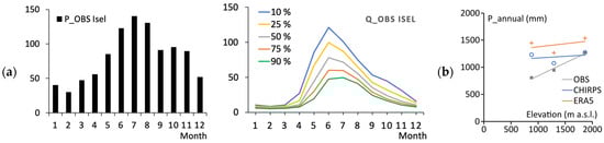 Average monthly precipitation and flow duration for characteristic durations (10, 25, 50, 75 and 90%) in the b3 Isel catchment (a) and annual precipitation in vertical bands with linear interpolation from observations and GPPs (b) in period 1991–2018.