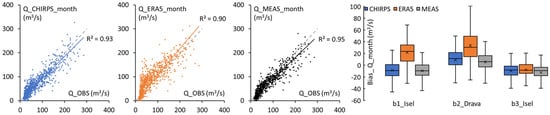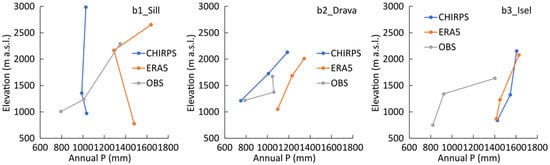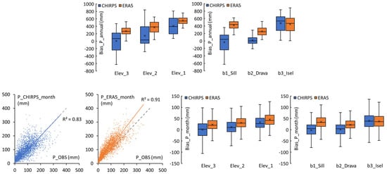 The precipitation amounts from the CHIRPS and ERA5 products were compared to observations for the annual, seasonal and monthly time steps in the period 1991–2018 (see Table 10). A general positive P bias is present for both products, but it is significantly lower for CHIRPS than for the ERA5 product (PB_P = 15% CHIRPS, 37% ERA5). The CHIRPS also shows a lower seasonal P bias (warm and cold seasons) at all elevation bands. The performance of both products is lower in the cold than in the warm season. A relatively small bias at higher elevations (>1500 m a.s.l.) (PB_P = 1% CHIRPS, 21% ERA5) increases significantly (PB_P = 50% CHIRPS, 68% ERA5) at lower elevations (<1000 m a.s.l.). This is then reflected in the vertical P lapsing, which is present in both products, but the rate of observed lapsing is not matched by the GPPs (Figure 5b). Both products show an unbalanced performance between catchments (vertical averaging), Figure 6. For the CHIRPS product, a small error in catchments b1 Sill (PB_P = −3%; MAE = 197 mm) and b2 Drava (PB_P = 2%; MAE = 101 mm) is significantly increased in catchment b3 Isel (PB_P = 45%; MAE = 477 mm). The ERA5 product shows a small error in catchment b2 Drava (PB_P = 27%; MAE = 258 mm) but a larger error in catchments b1 Sill (PB_P = 40%; MAE = 421 mm) and b3 Isel (PB_P = 43%; MAE = 449 mm). For the monthly time step, the ERA5 shows a stronger linear correlation to the observations (R2_P = 0.83 CHIRPS, 0.91 ERA5), but the CHIRPS shows a lower bias (PB_P = 15% CHIRPS, 37% ERA5) and lower MAE (MAE_P = 34 mm CHIRPS, 37 mm ERA5), Figure 7. The CHIRPS shows a smaller bias in monthly precipitation for all months except May.