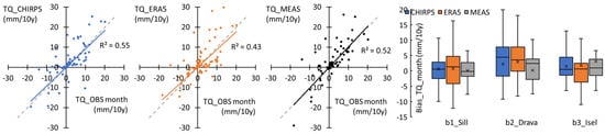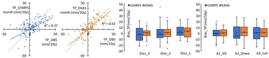 The precipitation trends from the CHIRPS and ERA5 products were compared to the observed trends (see Table 11). The precipitation trends are generally overestimated by both products. Generally, the CHIRPS shows lower TP bias, and ERA5 shows lower absolute error and lower discrepancy in the TP significance to the observed trend. The annual trends at lower elevations are significantly overestimated by both products (MAE_TP = 98% CHIRPS, 44% ERA5), which is mainly contributed by overestimated trends in the warm season in valleys. The spatial performance for the annual TP follows the spatial performance for the annual P. The CHIRPS show a higher performance than ERA5 in catchments b1 Sill (MAE_TP = 6 mm 10y−1 CHIRPS, 10 mm 10y−1 ERA5) and b2 Drava (MAE_TP = 27 mm 10y−1 CHIRPS, 33 mm 10y−1 ERA5) and a lower performance than ERA5 in catchment b3 Isel (MAE_TP = 42 mm 10y−1 CHIRPS, 32 mm 10y−1 ERA5). Both products show poor estimates of the seasonal precipitation trends in catchment b2 Drava with an opposite warm seasonal trend and an underestimated cold seasonal trend. For the monthly time step, the ERA5 shows a stronger correlation around the linear regression (R2 _TP = 0.37 CHIRPS, 0.63 ERA5) and a slightly lower error (MAE_TP = 9.5 mm 10y−1 CHIRPS, 7.5 mm 10y−1 ERA5), Figure 8. The bias in TP significance shows a lower number of missed significances in the monthly trends by the ERA5 product (24% misses for CHIRPS, 20% misses for ERA5). Both GPPs captured statistically significant positive TP for January, Februray and August and a statistically significant negative April trend, but only ERA5 replicated negative TP in June and October.