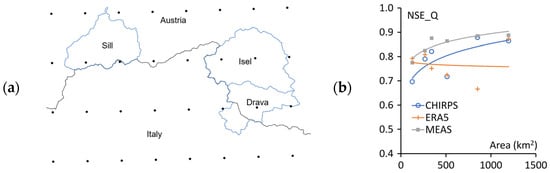 In the three catchments (b1 Sill, b2 Drava, b3 Isel), precipitation observations were available at 15, 12 and 13 gauging stations, respectively. The number of ERA5 grid points in the catchments (4, 6, 9) is significantly lower than the number of CHIRPS points (39, 33, 52). The scale discrepancy between the rain gauges and the GPPs is typical, and the location of the rain gauges usually does not coincide with the GPP grid centers. The common practice in evaluation studies is to upscale/downscale the rain gauge data to the grid scale of the GPP [51]. Two preprocessing approaches were tested in this study: (a) spatial algorithmic averaging and (b) single gauge precipitation. In the first approach, the gauges adjacent to each grid point were identified and then the spatially averaged precipitation was obtained. In the second process, the double mass curves for each of the adjacent gauges to grid points were evaluated, and the gauge with the best-fitting curve was selected as the reference. The double mass curve was similarly used in the assessment of gauged precipitation datasets during the assessment of GPPs [111]. The double mass curves bias for the spatially averaged precipitation were significantly higher than for the selected single gauges. Due to the considerable elevation differences in the pilot area and the higher bias from spatial averaged precipitation, the selected pairs of gauge and grid points were used in further assessment. Table 5 shows the selected pairs of gauges and grid points from the considered GPPs.
