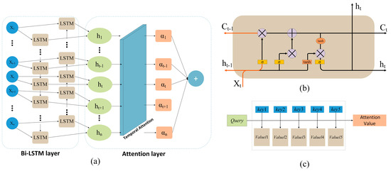 The framework and key layers of the proposed AT-BiLSTM model; (a) the proposed framework; (b) a structure of a Bi-LSTM single-layer structure; (c) the key structure of attention mechanism.