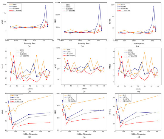 Figure 3 illustrates the relationship between the three key evaluation metrics (MAE, MSE, and RMSE) and the key hyperparameters (learning rate, ephemeral elements, and hidden dimension) for the four core sequence models (RNN, LSTM, Bi-LSTM, and AT-BiLSTM) on the test set. The visualized subplots showed a more consistent trend (as shown in Figure 3). Figure 3a–c show the nonlinear effect of learning rate on model performance. Moderately increasing the learning rate (0.0005–0.01 range) effectively reduced the prediction error, but too high a value (>0.03) destabilized the training process and led to a sharp decrease in model performance. The attention-enhanced AT BiLSTM showed more desirable robustness to learning rate fluctuations (MSE nearly 10% lower than the baseline RNN). The training iteration process in Figure 3d–f illustrates that the error metric initially decreased over 40–80 epoch and then stabilized as the number of repetitions decreased. Notably, the bidirectional architecture (Bi-LSTM/AT-BiLSTM) achieved more optimal performance than the unidirectional architecture. However, prolonged training beyond 90 epochs may lead to mild overfitting, especially in the complex AT-BiLSTM, where the validity error (MAE) increased by 20%. Hidden layer dimensionality studies (Figure 3g–i) identified critical capacity thresholds: hidden dimensions < 32 limit edmodeling capabilities (with higher MAE), while hidden dimensions > 128 led to over-parameterization. In the optimal configuration, the AT-BiLSTM with 64 hidden dimensions had a minimum MAE of 42.19, outperforming the smaller (16 hidden dimensions: 58.61) and larger (512 hidden dimension: 48.32) variants.