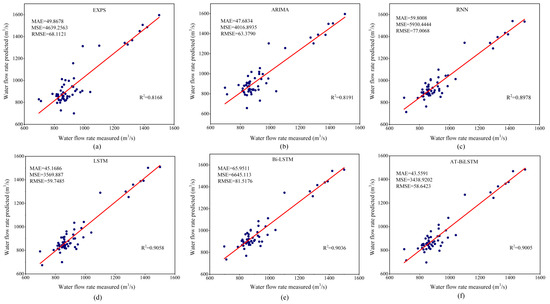 A comparison of the prediction performance of the five baseline models and the proposed AT-BiLSTM model on the dataset is depicted in Figure 4. The MAE, MSE, and RMSE results are shown in the upper left corner of each subplot, while the R2 scores are shown in the upper right corner. For all river flow forecasting methods, the ideal state model with predicted values (denoted as discrete points) clustered around the diagonal and aligned with the observed values. The results indicate that the proposed AT-BiLSTM had a better overall performance in water flow forecasting compared to the EXPS, ARIMA, RNN, LSTM, and Bi-LSTM baselines. Among these six methods, the classical conventional models did not perform as well as the mainstream deep learning methods, e.g., EXPS had the worst R2 (0.8168). Notably, all three models—LSTM, Bi-LSTM, and AT-BiLSTM—achieved R2 values above 0.9, proving their very good data fitting ability. Among the four deep learning models, the RNN ranked the lowest (MAE = 59.80), trailing behind the LSTM, Bi-LSTM, and AT-BiLSTM. It is noteworthy to note that the integration of the mechanism reduced the MAE, MSE, and RMSE in the Bi-LSTM framework. This improvement stemmed from the ability of the attention layer to dynamically weight the input features over time steps. Similarly, replacing LSTM with Bi-LSTM improved temporal pattern capture by augmenting the error metric with bidirectional learning of the hydrological time series during pre-training. By synergistically combining Bi-LSTM and the attention mechanism within the standard LSTM architecture, the proposed model significantly reduced the MAE, MSE, and RMSE on the Shizuishan Yellow River dataset by 27.16%, 42.01%, and 23.85%, respectively, compared to the baseline RNN.