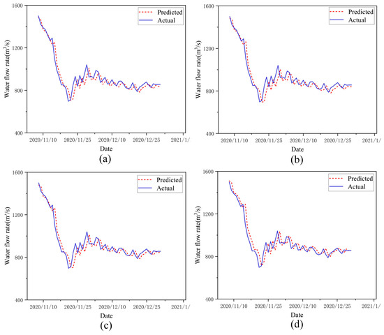 Comparison of predicted and actual water flow values from four experiments. (a) The first experiment; (b) The second experiment; (c) The third experiment; (d) The fourth experiment.