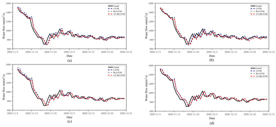 To display the data in Table 2 more intuitively, we expressed the prediction results of the AT-BiLSTM model in four subfigures separately. Figure 5 shows the prediction trajectories of four independently trained AT-BiLSTM models, where the blue curves indicate the actual measurements and the red dashed lines indicate the model predictions. The results show that the agreement between predicted and observed values was very high in all four subplots, and the proposed AT-BiLSTM consistently achieved the desired prediction performance in all training variants.