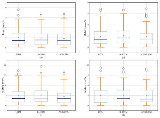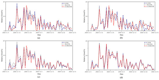 To evaluate the predictive performance and robustness of three LSTM variants, we conducted ablation studies by calculating the relative error fluctuation rates across four independently trained models. Figure 6 and Figure 7 systematically present the comparative model analysis and error distributions from this ablation framework. The closely aligned trajectories across all four subplots in Figure 6 demonstrate strong architectural stability during repeated training trials. The visual analysis of operational details (e.g., Figure 6a magnification) reveals that the proposed AT-BiLSTM with attention mechanisms outperformed baseline LSTM/Bi-LSTM counterparts in both trend alignment and peak–valley feature capture. The relative error distribution for each model is shown in Figure 7. Overall, it can be concluded that the attention mechanism enhanced the prediction accuracy of the majority of sharp points and lowered the error percentage of the regular Bi-LSTM and LSTM models.
