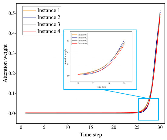 This subsection focuses on the temporal attention dynamics of the AT-BiLSTM model, employing visualization techniques to demonstrate its attention allocation patterns in different time steps. Figure 9 illustrates the evolution of the attentional weights of the input sequences in four independent training instances of AT-BiLSTM, where the x-axis denotes the prediction time step and the y-axis quantifies the values of the attentional weights. The analysis shows that the attentional weights exhibited a dynamic adjustment as the prediction time progressed, as manifested by the gradual strengthening of their weights within the temporal attention tilt. This mechanism can focus the attention differentially on key historical points in the time series, thus improving the prediction performance of the model.