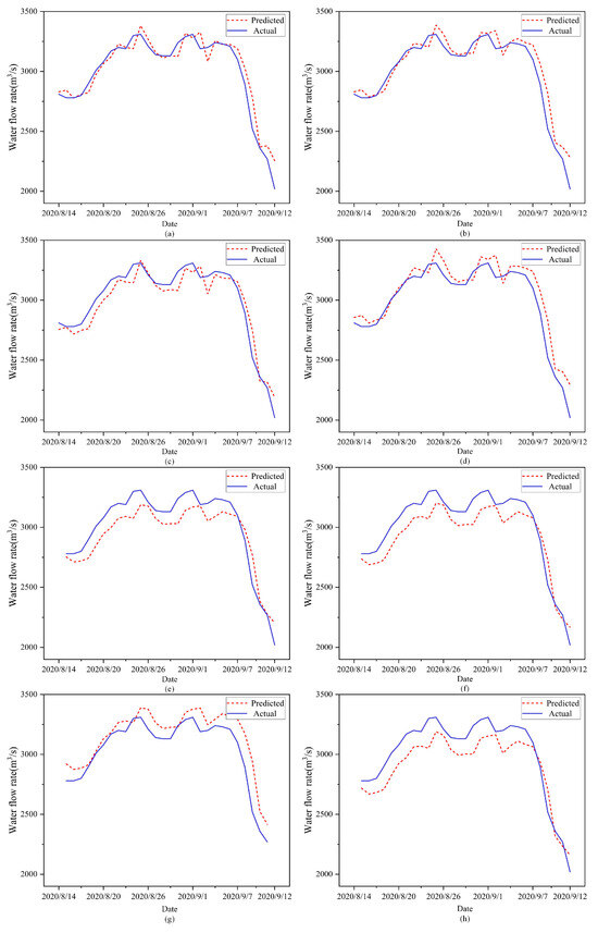 Comparison between predicted values and actual water flow values on different time retracement window; (a) the first trained model at windowsize = 10; (b) the second trained model at windowsize = 10; (c) the third trained model at windowsize = 10; (d) the fourth trained model at windowsize = 10; (e) the first trained model at windowsize = 20; (f) the second trained model at windowsize = 20; (g) the third trained model at windowsize = 20; (h) the fourth trained model at windowsize = 20.