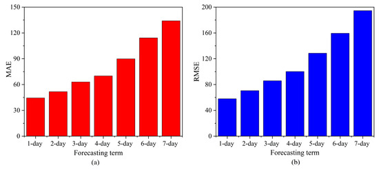 Performance comparison of 1–7-day forecasts of AT-BiLSTM models. (a) AT-BiLSTM model MAE for 1- to 7-day river flow forecasts; (b) AT-BiLSTM model RMSE for 1- to 7-day river flow forecasts.