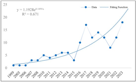 This study conducted a statistical analysis of the publication volume, as shown in Figure 2, which revealed an overall upward trend in the research domain of soil permeability at the watershed scale using the SWAT model over the past 25 years. This indicates the current prominence of this domain among researchers. The SWAT model was first used in 1999 to analyze excess rainfall on basin-scale basins []. Between 1999 and 2004, there was a temporary absence of new research findings in this field. From 2005 to 2017, research in this field showed a stable growth trend, with a total of 64 papers published, approximately 45% of the total literature. During this period, the literature mainly focused on the fields of Water Resources (45 articles), Agriculture (19 articles), Engineering (18 articles), and Environmental Sciences Ecology (16 articles). During the period from 2018 to 2021, a slight decline was observed. However, after 2021, there was a resurgence in publication volume. Additionally, since 2018, there has been increased attention in the fields of Environmental Sciences, Ecology, Geology, Meteorology Atmospheric Sciences, and Biodiversity Conservation. This suggests that scholars are increasingly concentrating on the relationship between this field and ecosystems.