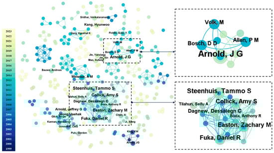The most prolific author in this field is Steenhuis, Tammo S., with a total of five articles. The second authors are Easton, Zachary M., Fuka, Daniel R., Arnold, J.G., and Collick, Amy S., each with four articles. By setting the note type to “author”, we constructed a knowledge graph of the articles’ authors (Figure 3). There are 287 nodes, 444 lines, and a network density of 0.0108. Each node represents an author, with larger nodes indicating more frequent occurrences. Lines between nodes indicate that they have a cooperative relationship. Figure 3 shows that there are currently two major core research teams in this field: those centered on Steenhuis, Tammo S., and Easton, Zachary M., and those centered on Arnold, J.G. The teams are essentially in an independent research phase among themselves.