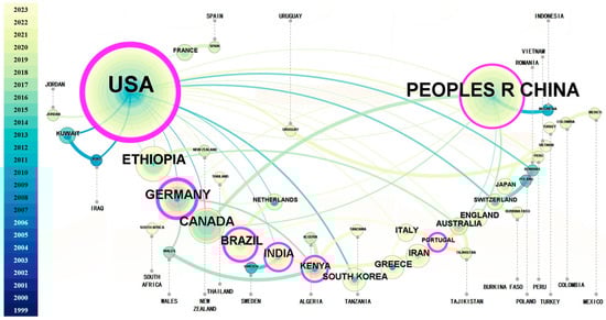 National collaborative mapping, 1999–2023 (the node size represents the number of publications that originated from the country, and the purple rings represent the mediated centrality of the node, and their thickness reflects the centrality value).
