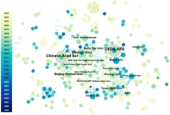 Secondly, we identified that the top five institutions collectively published 61 articles (Table 1). Among them, four institutions are located in the United States. They are the United States Department of Agriculture (USDA) (14 articles), Cornell University (9 articles), Agricultural Research Service (6 articles), and Purdue University (6 articles). Additionally, two institutions are based in China: Chinese Academy of Sciences (13 articles) and Beijing Normal University (7 articles). This indicates that academic institutions in the United States hold a prominent position in researching soil infiltration at the watershed scale using the SWAT model, followed by China. Bahir Dar University (6 articles) in Ethiopia is also one of the main contributing institutions. These research institutions have formed relatively dense collaborative networks, while there are still a significant number of institutions operating independently in their research endeavors (Figure 5).
