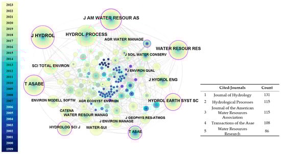 To provide an overview of the types of journals that have served the field of soil infiltration research at the watershed scale using the SWAT model during the period 1999–2023, we conducted a journal co-citation analysis (with g-index k = 5, time slice = 1) of the retrieved literature as demonstrated in Figure 6. The majority of the cited journals have relatively high impact factors, indicating a certain level of scholarly attention towards research related to watershed-scale soil infiltration analysis using the SWAT model. This provides a theoretical foundation for further scientific advancement in this field and its related research directions in the future. As shown in Figure 6, the journal with the highest number of citations is the Journal of Hydrology (133), followed by Hydrological Processes (115) and Journal of the American Water Resources Association (115). Moreover, research in this field spans various disciplines, including Earth science, environmental science, agricultural and forestry science, ecology, soil science, water resources, and hydrological management.