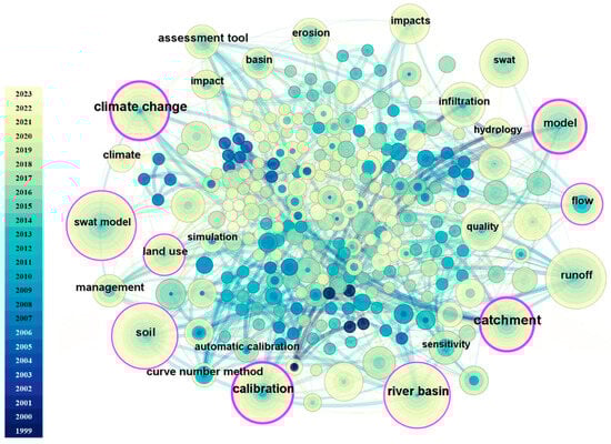 Keywords convey the core themes of a study, with higher frequencies indicating the prevailing research hotspots and focal points at that time []. In the CiteSpace analysis, the network node type was set as “keyword”, with a time slice of 1 year, and the g-index was set to k = 20. Figure 7 illustrates the keyword co-occurrence network within this research domain spanning the years 1999 to 2023. The graph comprises 271 nodes and 999 lines, with a density of 0.0273. The size of each node is proportional to the frequency of the corresponding keyword. Table 3 lists the top 10 keywords based on frequency and intermediary centrality. The results indicate that the “SWAT model” is the most frequently occurring keyword (36 times), followed by “runoff” (33 times), “soil” (32 times), and “river basin” (30 times). The keyword with the highest intermediary centrality is “catchment” (0.29), followed by “calibration” (0.27), suggesting that the focal point of research in this field may lie in enhancing water and soil conservation capabilities. Furthermore, keywords such as “climate change” and “infiltration” exhibit high occurrence frequencies and certain mediated centrality, confirming that the two themes should be focal points of attention in this field, regardless of the indicator used.