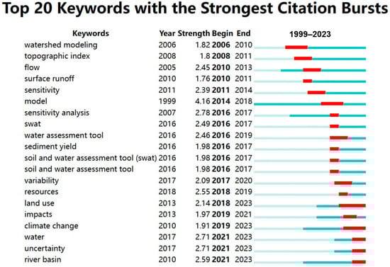 Analyzed the keywords with the strongest citation bursts, we found three main trends emerging in the research field of “analyzing soil infiltration at the watershed scale using the SWAT model”: (1) The scale of research is continuously expanding. (2) The research subjects are diversified, ranging from initially focusing on agricultural watersheds to surrounding areas such as hillsides, grasslands, and forests. (3) The research content becomes more systematic, emphasizing regional coordination and ecological sustainability. Therefore, against the backdrop of climate change, it is imperative to further investigate the rational application of the SWAT model for watershed-scale soil infiltration and its connection to sustainable ecosystem development.
