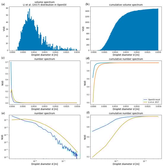 Droplet size distribution analysis of oil droplets simulated by OpenOil, compared with empirical data from Li et al. [34]: (a) volume spectrum of oil droplets; (b) cumulative volume spectrum; (c) number spectrum of droplets; (d) cumulative number spectrum; (e) number spectrum on a logarithmic scale; and (f) cumulative number spectrum on a logarithmic scale. Blue lines represent OpenOil results; orange lines represent [34] distribution.