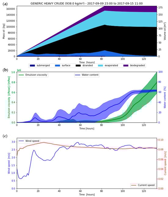 Oil budget evolution and weathering characteristics were simulated for generic heavy crude (938.0 kg/m3) over a period of 132 h (from 9 September 23:00 UTC to 15 September 11:00 UTC), representing conditions following the Agia Zoni II oil spill. The top panel (Figure 3a) illustrates the time evolution of oil mass partitioned among key fate processes: dispersed, submerged, surface-resident, stranded, evaporated, and biodegraded. Early in the simulation, a substantial portion of the oil accumulates on the surface and rapidly transitions to the stranded category, indicating significant shoreline interaction. By around hour 100, the stranded mass plateaus, dominating the oil budget. The evaporated fraction increases steadily but remains modest relative to stranded and surface-bound oil. Submerged and dispersed fractions remain minor throughout, suggesting low mixing energy or a tendency for the heavy crude to resist vertical entrainment. Biodegradation becomes noticeable only in the final stages of the simulation, with a slow but consistent rise in mass, indicating the onset of biological transformation processes. The middle panel (Figure 2b) shows the evolution of two key weathering parameters: emulsion viscosity (green shaded area) and water content (blue shaded line), both of which increase markedly in the final third of the simulation. Water content surpasses 60% after 100 h, stabilizing near that level, while emulsion viscosity climbs sharply in the last 24 h to values exceeding 9 × 105 cPoise/mPa·s, characteristic of a highly viscous, water-in-oil emulsion. The shaded regions suggest spatial variability, likely resulting from differing exposure conditions (wave energy, oil patch size). The bottom panel (Figure 3c) depicts wind speed (blue line, left axis) and current speed (red line, right axis). Wind speed remains variable but generally stays within 1.5 to 3 m/s, which is sufficient to induce surface agitation and potentially facilitate emulsification. Current speed shows a mild downward trend, decreasing from just above 0.09 m/s to about 0.08 m/s, suggesting weak horizontal transport forces. These relatively low environmental energy conditions contribute to the dominance of surface accumulation and shoreline stranding, with limited dispersion or vertical entrainment. Overall, the simulation indicates that under the environmental conditions specific to the Agia Zoni II timeframe, the oil primarily becomes stranded or remains at the surface, with slow weathering, high emulsification, and minimal biodegradation over the modeled period.