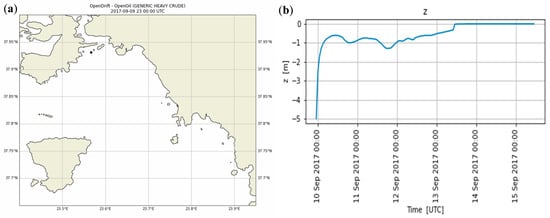 (a) Initial release of oil particles at the time of the Agia Zoni II shipwreck, simulated using the OpenOil model and (b) temporal evolution of particle mean depth (z) from 10 September to 15 September 2017.
