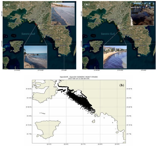 (a1,a2) In situ observations vs. (b) simulated oil distribution on 14 September 2017 at 11:00 UTC. The field photographs were obtained from local news portal alimosonline.gr [35].