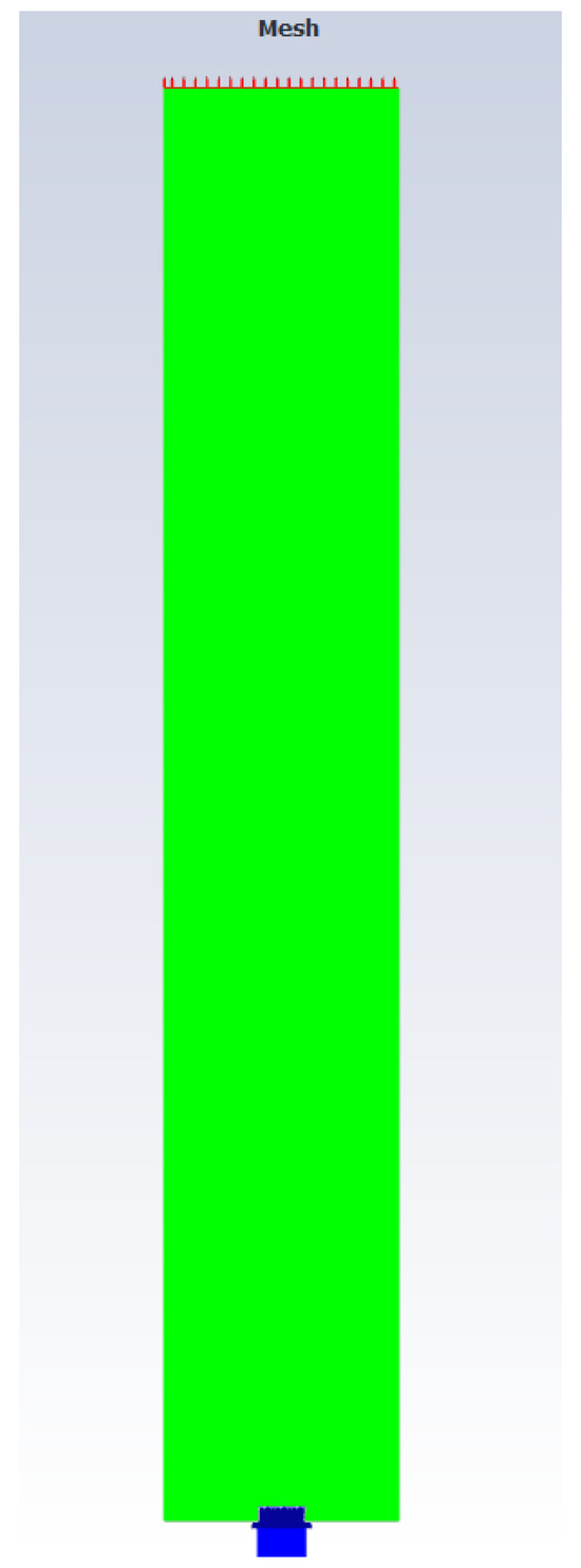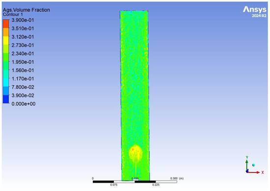 As seen in Figure 13 and Figure 14, the distribution of aerobic granular sludge within the reactor is well distributed, with most of the sludge at the bottom of the reactor and a small gradient effect to the top. Where the simulation shows the airstream in Figure 14, it can be seen that as air rises, some granules are being carried up with it. The figures show the velocity of the air stream is not too harsh, where structural damage could happen to the bed, and the mixing at the bottom of the reactor is good. Had the simulation been able to run for a longer period of time, we believe the results would have shown efficient mixing throughout the reactor, integral for oxygen diffusion between the biomass and substrate, therefore driving good or bad performance. In order to enhance substrate removal, the aeration flow rate could be increased by only a small amount to 2.5–2.8 cm s−1.