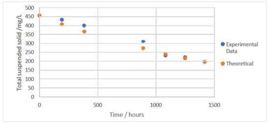 Microbial growth in Figure 9 is larger than that predicted in Figure 8, 128 mg L−1 compared to 87 mg L−1 because the COD removed is greater, 240 mg COD L−1 compared to 150 mg COD L−1. However, the model does not consider the complex mechanism present when substrate overload occurs as discussed above.