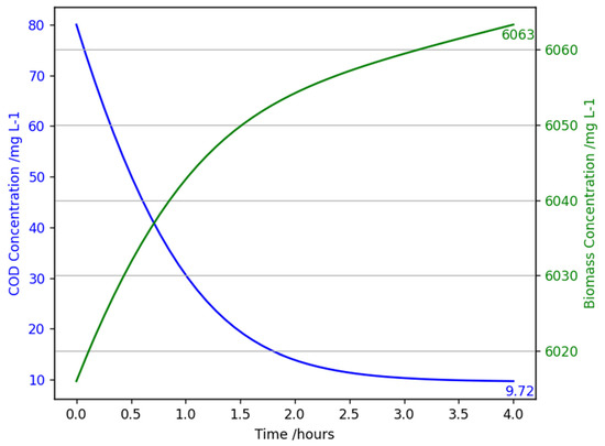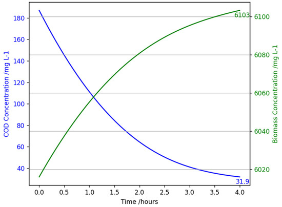 As expected, Figure 10 presents the improvement of removal efficiency when influent concentration is smaller, 87.9% compared to 82%. As seen by the green line, the biomass growth is slower than the results at standard conditions (47 mg L−1 compared to 87 mg L−1) as the overall amount of COD removal is less than at higher concentrations. To validate the accuracy of the model, provided data using a cycle with an influent flow rate of 98 resulted in an 85.7% removal of substrate. Subsequently, this shows the predicted efficiency is within a reasonable range of the lab results.