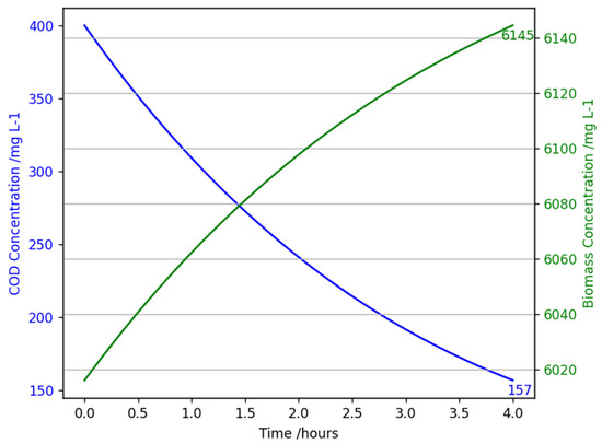 A graph showing chemical oxygen demand concentration (mg L−1) and biomass concentration (mg L−1) against time (hours) for the mathematical model of an aerobic granular sludge continuous flow reactor with an influent chemical oxygen demand of 400 mg/L, at 20 °C, 1 atm, and an HRT of 4 h.